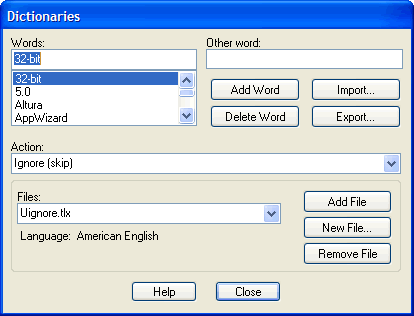 | Remove File | Click to close the currently selected dictionary file. Closed dictionaries are not checked during a spelling check. Although the file is closed, it is not deleted. Closed dictionary files can be later reopened clicking the Add File button. |