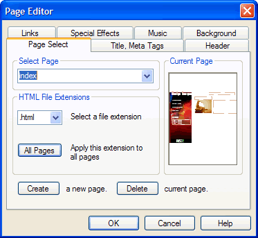 Use the Page Select Tab on the Page Editor dialog box to select a page for editing, rename a page, set a page’s HTML file extension, or add or delete a page from your project.