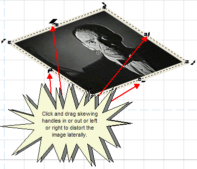 The easiest way to skew an object is manually in the Work Window using your mouse. With an object selected and the Object Edit button in the Components Bar activated, you can click and drag the object’s four skewing control points left and right or in and out to skew the object vertically or horizontally. You will know that your mouse is over a skewing control point when your mouse pointer becomes a black parallelogram. As you drag, the degree of the skew is displayed near the mouse pointer.