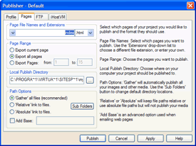Use the Pages Tab of the Publisher dialog box to select the pages of your project you would like to publish, make changes to file names or extensions (if required), specify a directory on your computer to publish to (when publishing locally or when publishing to your own web host via FTP), and determine file path and upload options for images and other media.
