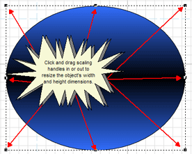 The easiest way to scale an object is manually in the Work Window using your mouse. With an object selected and either the Page Layout or Object Edit buttons in the Components Bar activated, you can click and drag the object's eight scaling control points in or out to resize the object's height and width dimensions. You will know that you have grabbed a scaling control point when your mouse pointer becomes a double-headed arrow. As you drag, the new pixel dimensions of the object are displayed near the mouse pointer.